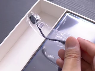 Pada kotak di sebelah ponsel terdapat kabel data USB Type-C berwarna hitam dengan panjang sekitar 1 meter..